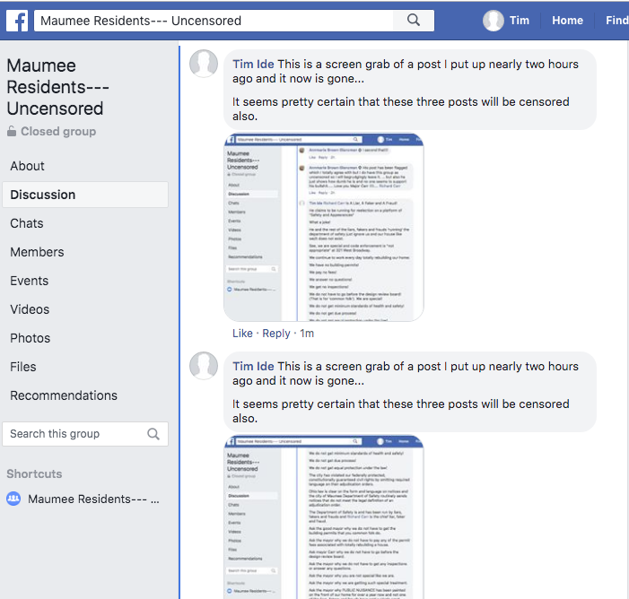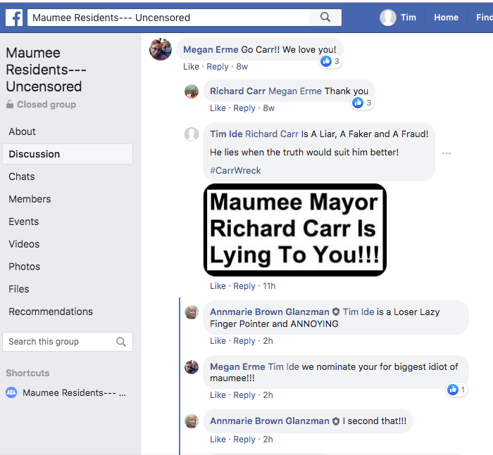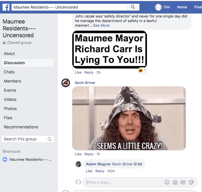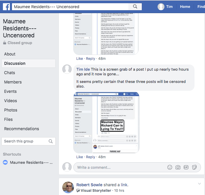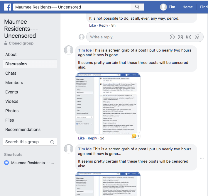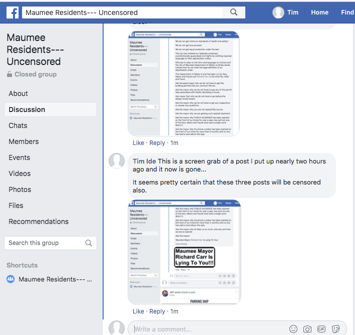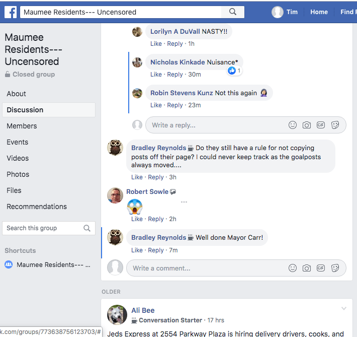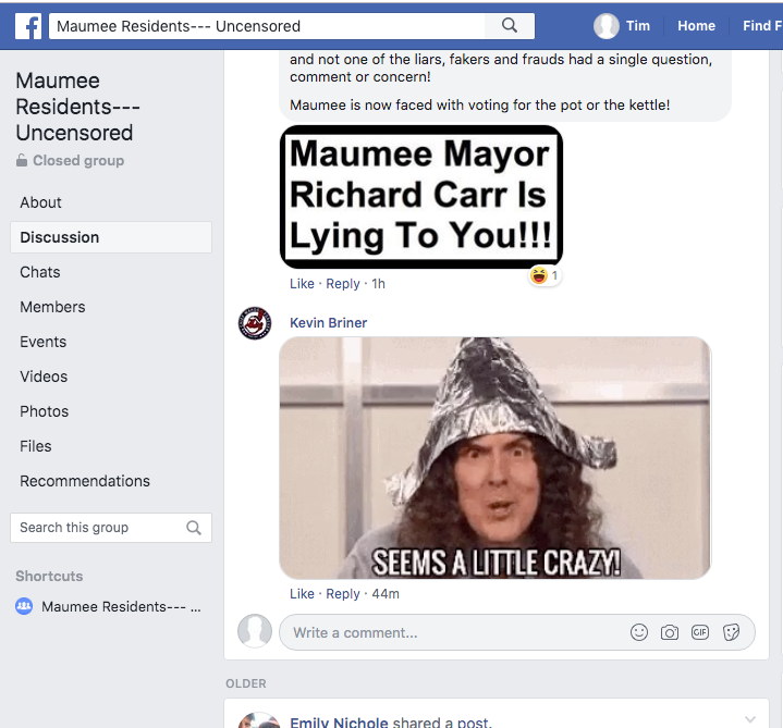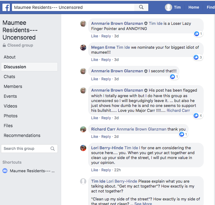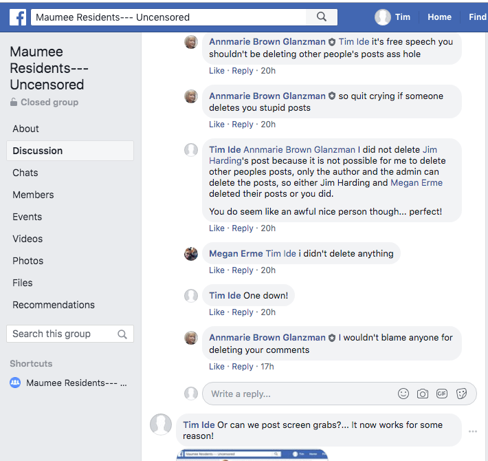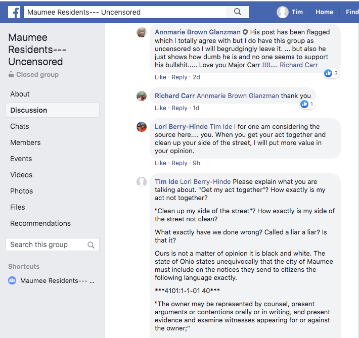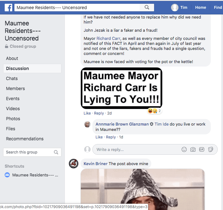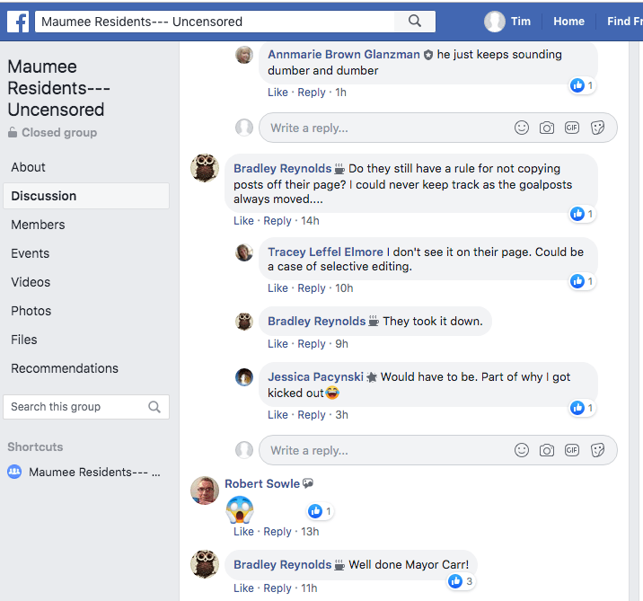 Screen Shot of posts in the closed Facebook group Maumee Residents Un—censored.