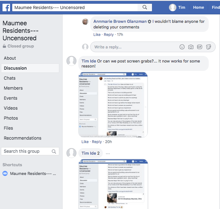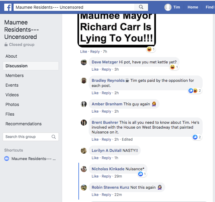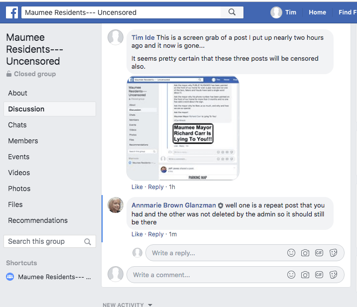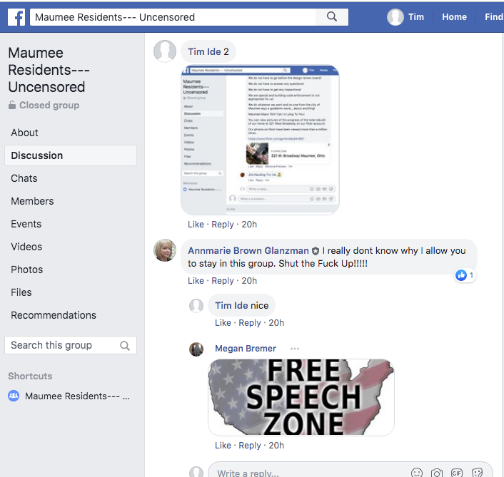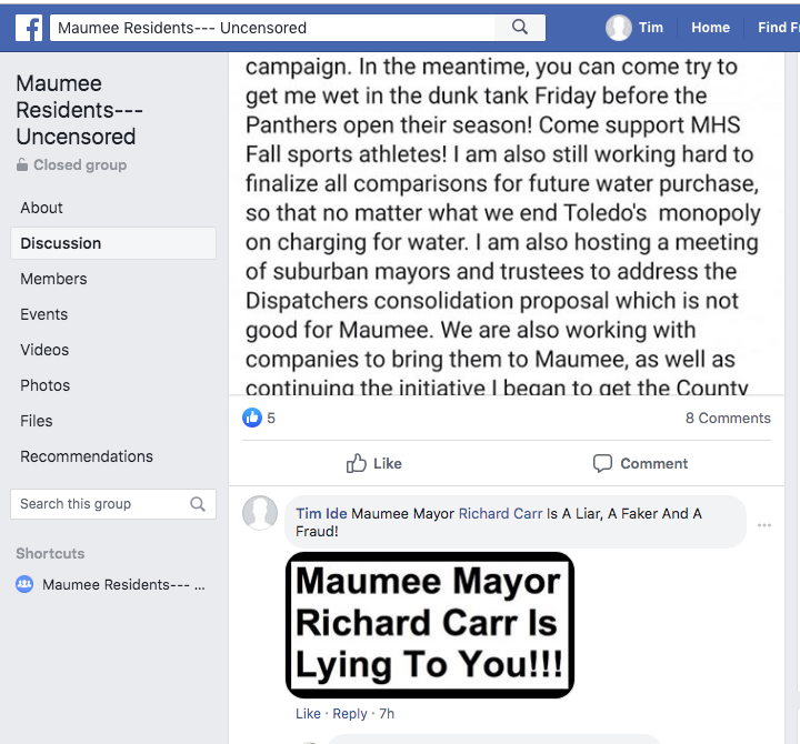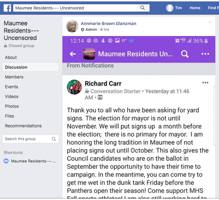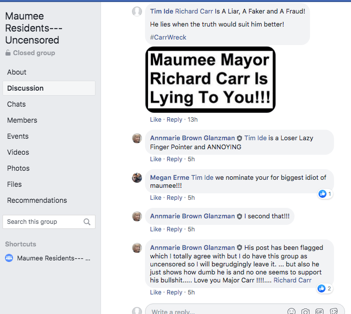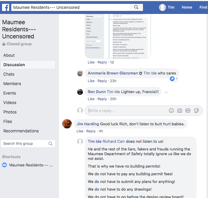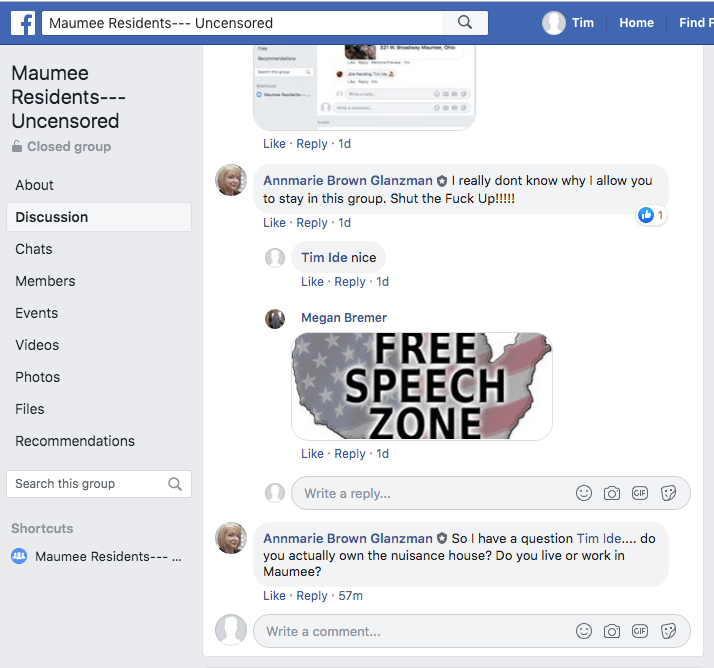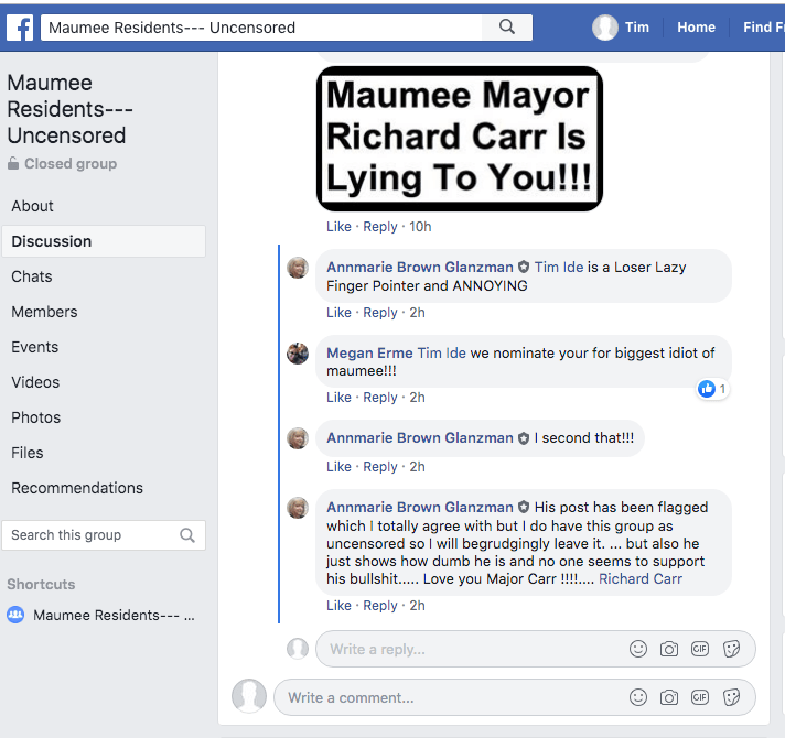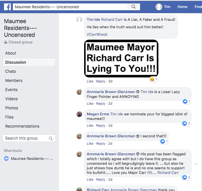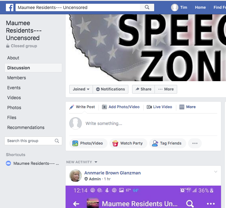 Screen Shot of posts in the closed Facebook group Maumee Residents Un—censored.