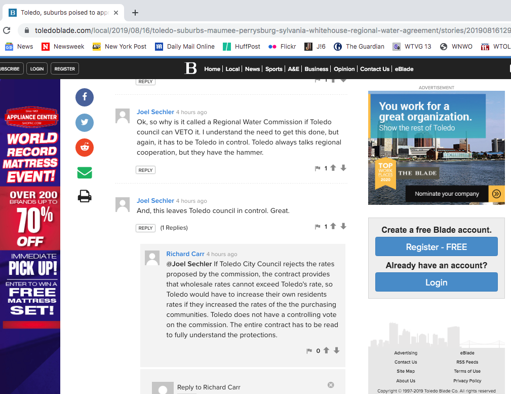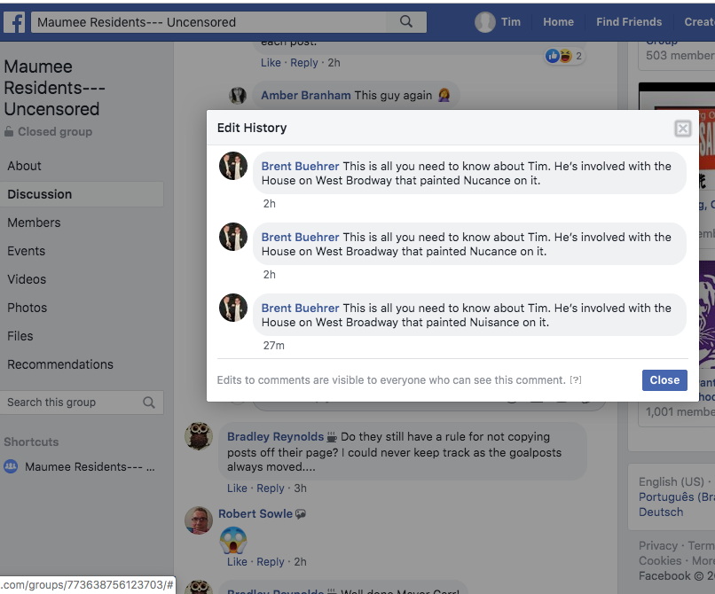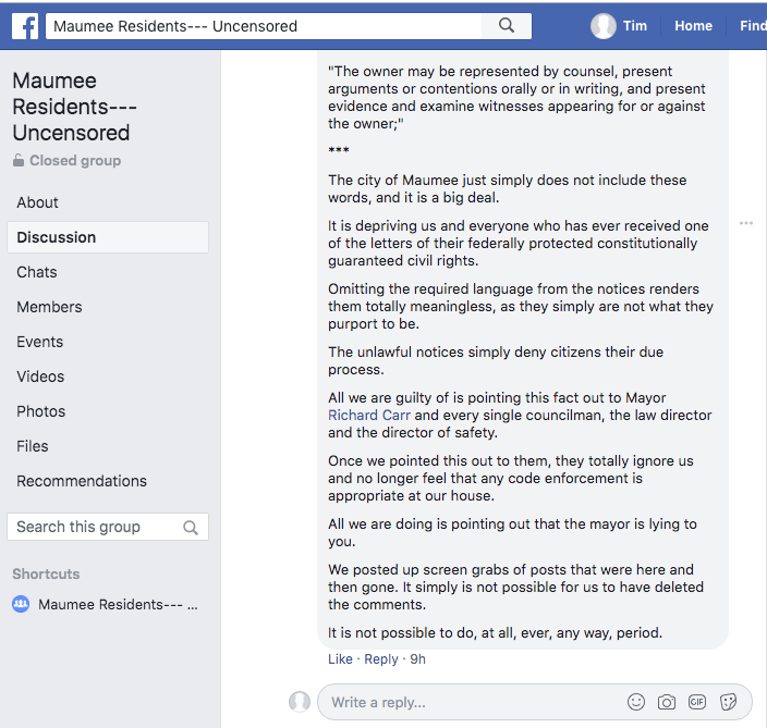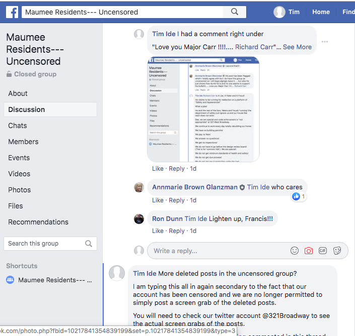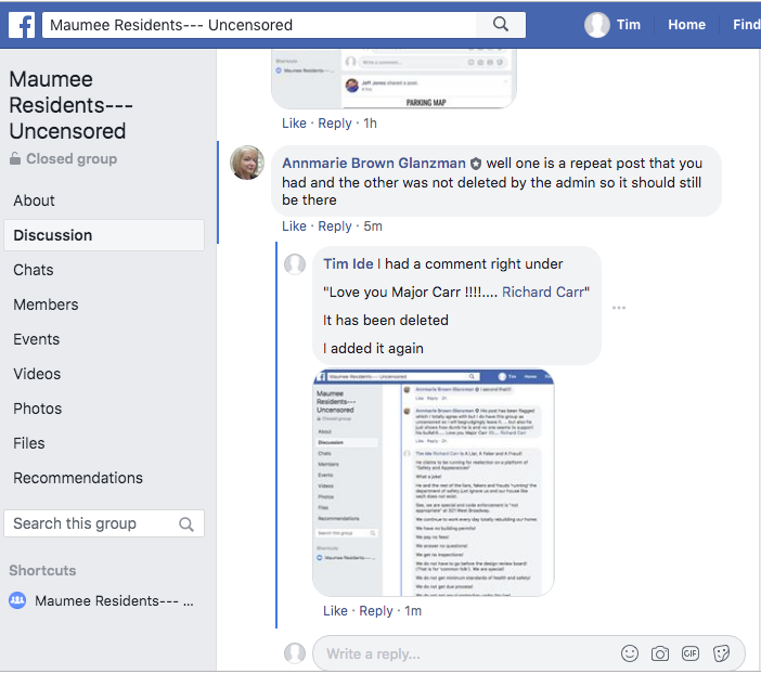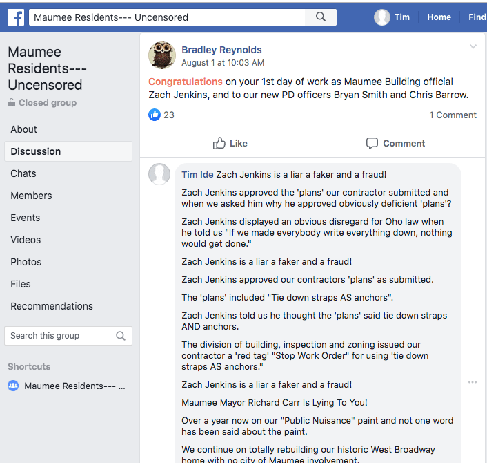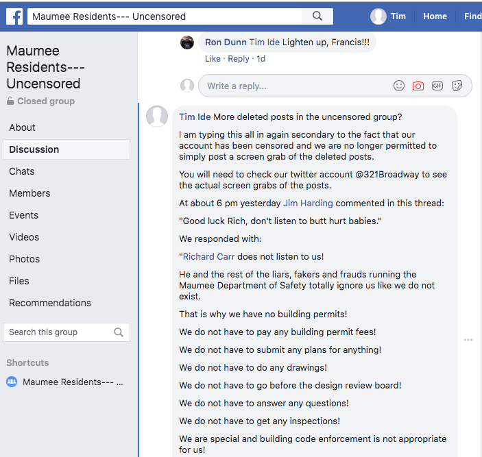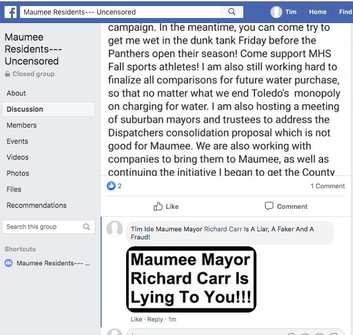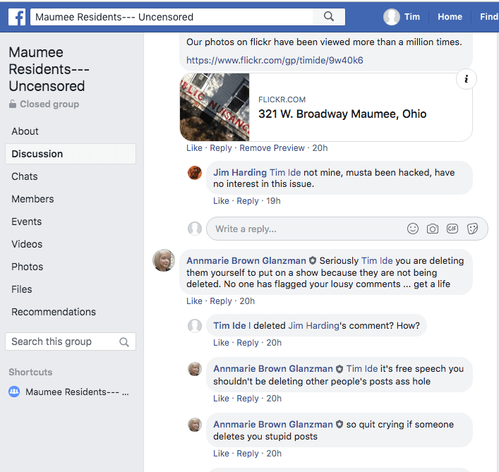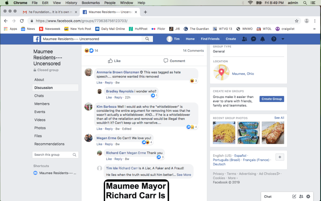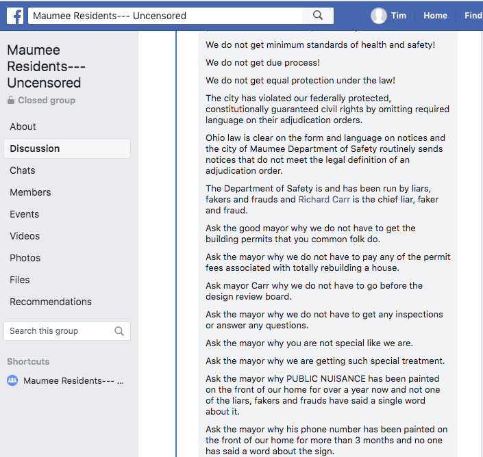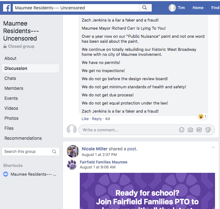 Screen Shot of posts in the closed Facebook group Maumee Residents Un—censored.