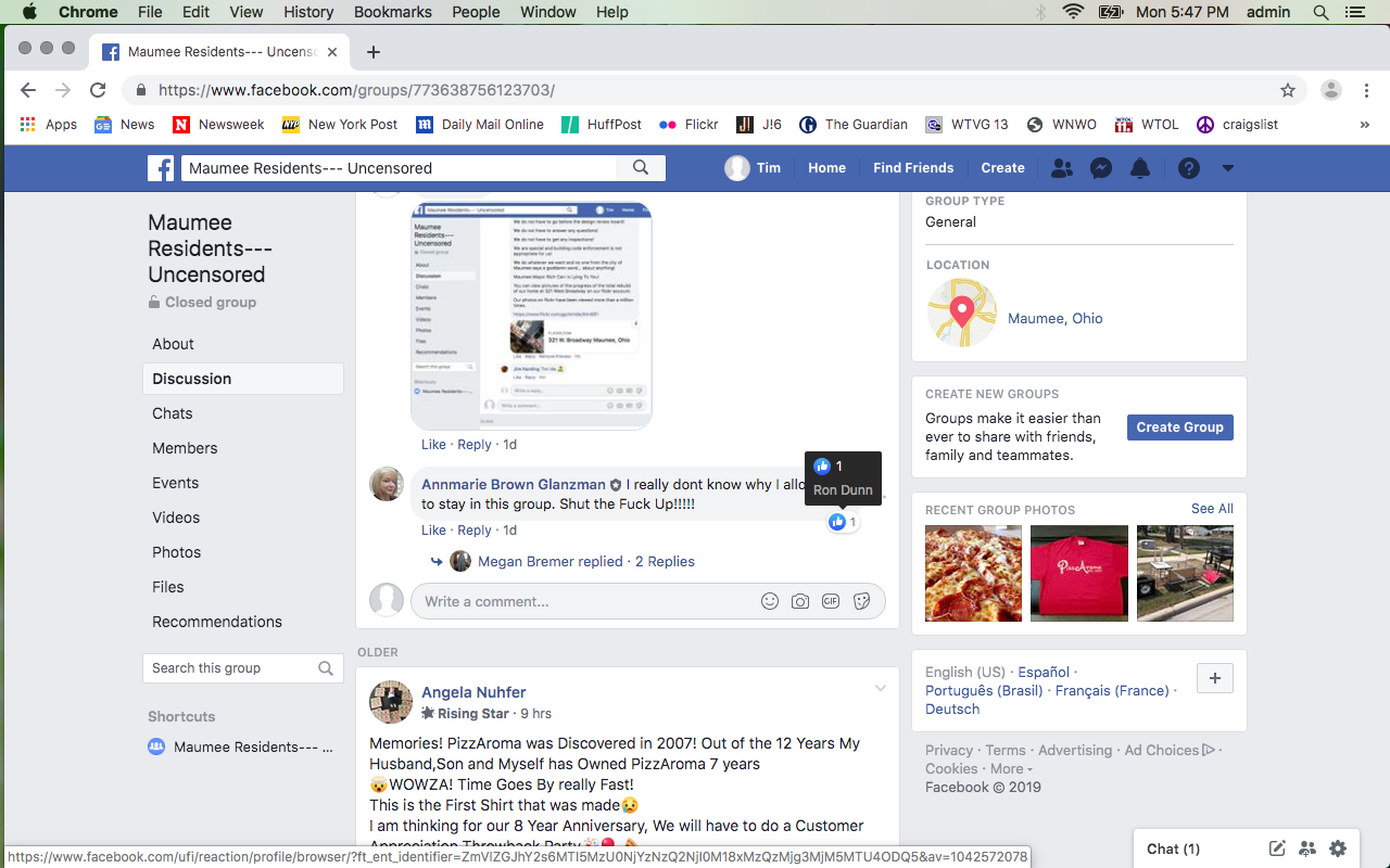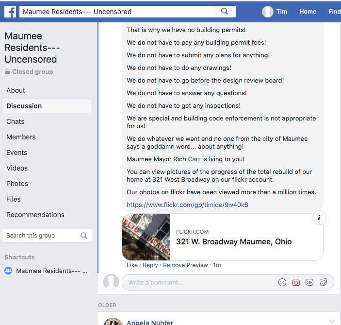 Screen Shot of posts in the closed Facebook group Maumee Residents Un—censored