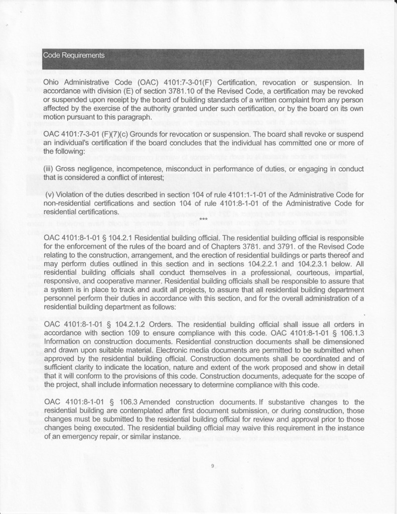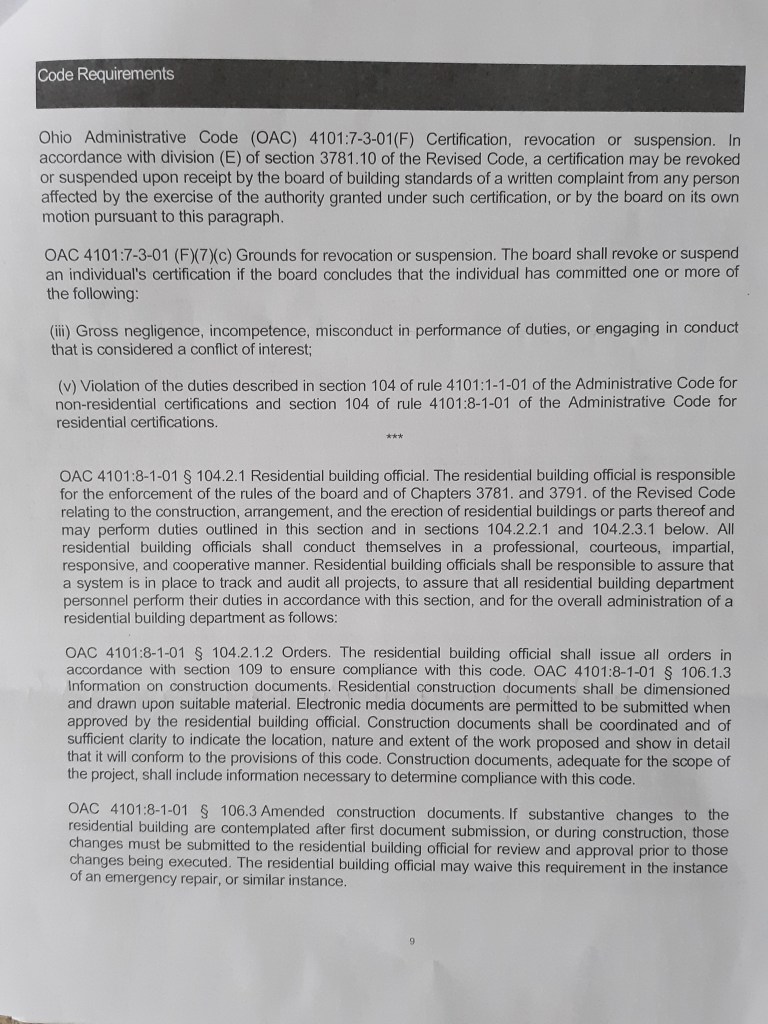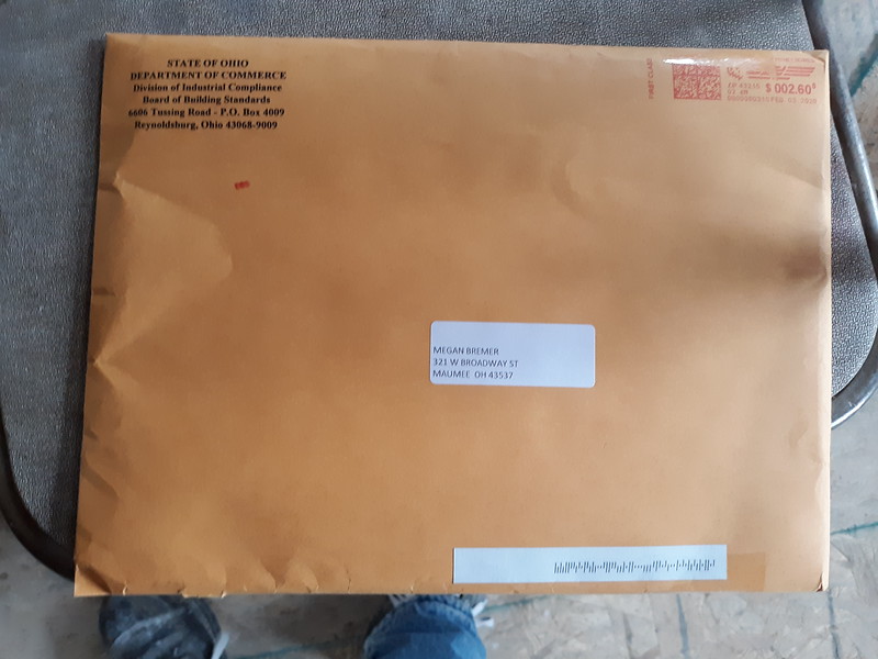 Received via regular U.S. Mail from the Ohio Department of Commerce, Board of Building Standards.