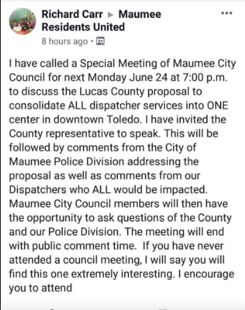 Screen Shot of post Mayor Rich Carr posted this announcement in the closed Facebook group Maumee Residents United and someone, not the Mayor, reposted into the closed Facebook group Maumee Residents—Uncensored. If you lived in Maumee but were not in one of these closed Facebook groups you did not see the notice.