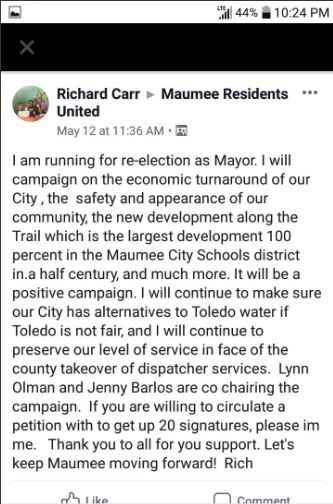 Screen Shot of Mayor Rich Carr’s announcement from May 12th at 11:36 AM. that he was running for re-election from closed Facebook group Maumee Residents United. You could only see this announcement if you were a member of the group.